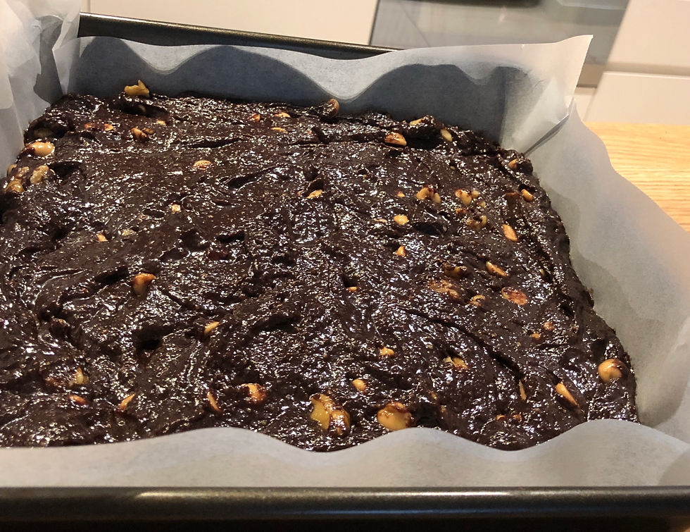 6. Pour half the brownie mixture into a baking tray (I use a rectangular one (28 x 18 cm)